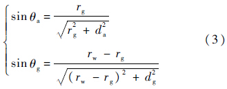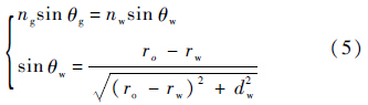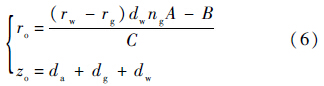 不失一般性,本文分析考察二维情况,并假设折射界面与图像成像平面平行.非平行界面情况下,只需要旋转相机即可.图 1所示水下相机二维成像过程如图 2所示.相机的中心位于c(0,0).对于场景点xo水下相机模型下的图像点为xa(ra,f),传统单视点相机下的成像点为xp,下面推导分析xa与xp之间的关系.记光线空气-玻璃折射界面交于xg(rg,zg)(如图 2所示),其坐标分量为