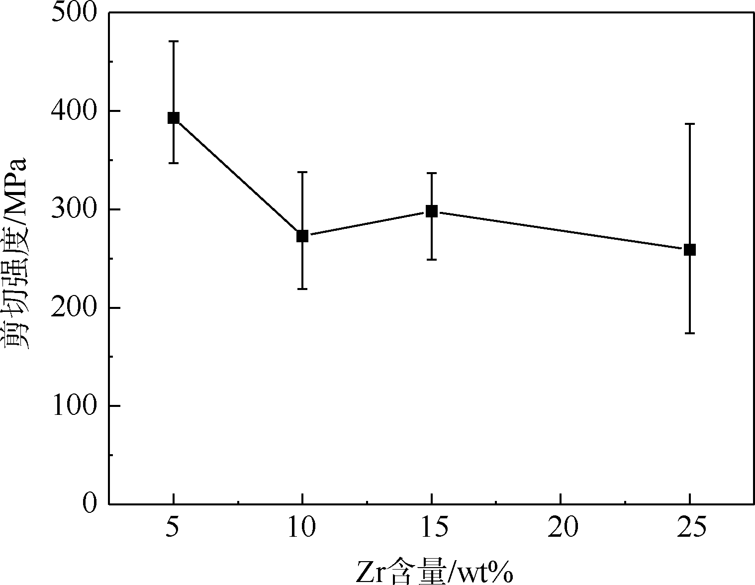 钎焊接头的剪切强度如图 6所示.从图中可以看出,钎料中的Zr含量对钎焊接头的剪切强度有显著影响,当Zr含量为5wt%时,钎焊接头的剪切强度取得最大值(393MPa).当Zr含量增加到10wt%时,钎焊接头的剪切强度下降到273MPa.Zr含量增加到15wt%时,钎焊接头的剪切强度为298MPa,进一步增加Zr含量到25wt%,接头的剪切强度最低(259MPa).