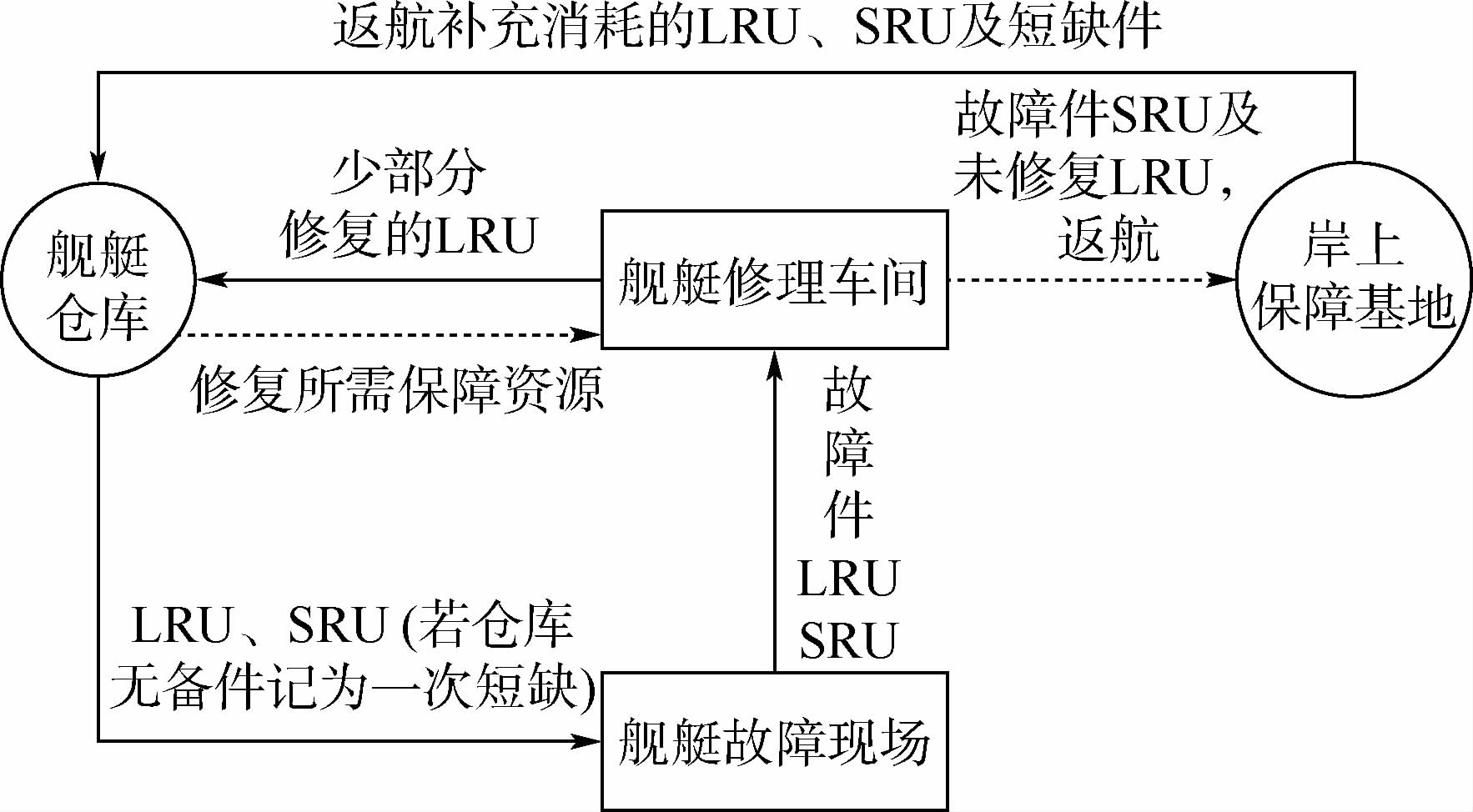 1 单舰海上备件保障模式分析单舰海上执行任务时备件保障模式如图 1所示,其中用于故障现场可更换的备件,按所属的层次不同可分为现场可更换单元(Line-Replaceable Unit,LRU)和车间可更换单元(Shop-Replaceable Unit,SRU),本文讨论备件保障模式的背景为舰艇海上执行任务期间,对于岸上进行的备件修理不作讨论;舰上仓库存放故障现场修理所需的备件LRU及SRU;由于舰艇修理车间的修理水平相当于舰员级,其修理能力水平有限,故其作用主要是更换LRU及SRU,本文模型假设故障件修理只要更换一个LRU或SRU即可修复完好,因而故障件更换的过程可以看成是相对独立的修理过程,同时具备耗费少量人力、物力资源修复少量LRU的能力,修复完好的LRU送到舰艇仓库存起来当作库存备件供后续使用,和舰上数以万计的备件存储量相比,上述事件发生的次数可以看作是小概率事件,本文模型假设舰上所有故障件都是可以被更换的但却不能在舰艇修理车间进行修复;同时,因SRU修理需要中继级修理能力水平,所以故障的SRU件被存放在舰艇仓库,等返航后统一上报给岸上基地进行处理,具有修复价值的进行修理,修复完毕后存放在岸上仓库,没有修复价值或者不能修复的直接报废.