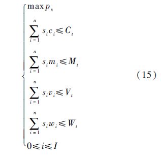 步骤2 将备件质量、体积、费用及维修能力约束统一转化为系统资源约束zi后,随船备件保障概率可表示为