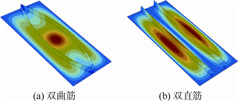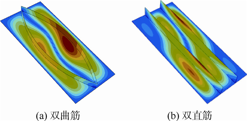 图 7 单轴载荷下双曲筋和双直筋的一阶模态Fig. 7 First step mode of two curvilinear stiffeners