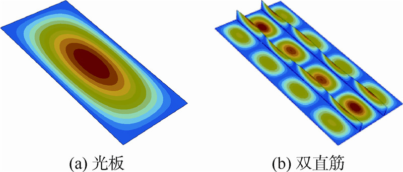 图 9 组合载荷下光板和单直筋的一阶模态Fig. 9 First step mode of bare board and