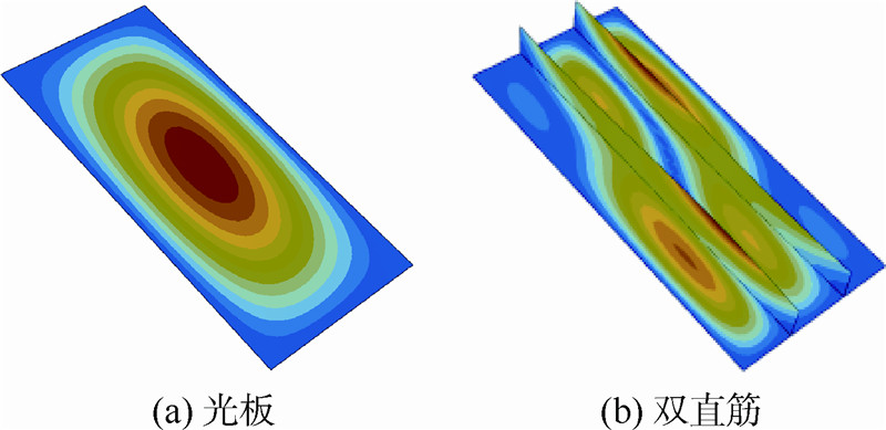 图 14 组合载荷下光板和双直筋的一阶模态Fig. 14 First step mode of bare board and