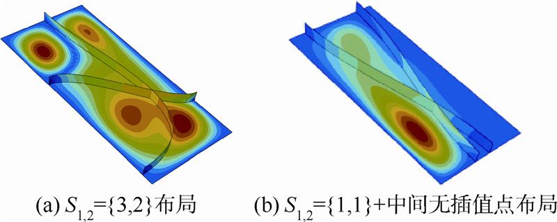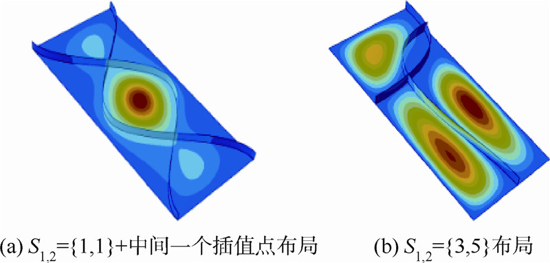 组合载荷下光板和双直筋的一阶模态如图 14所示,组合载荷下S1,2={1,1}+中间一个插值点布局和S1,2={3,5}布局的一阶模态如图 15所示.图 16所示为组合载荷下S1,2={3,2}布局和S1,2={1,1}+中间无插值点布局的一阶模态.优化结果表明,S1,2={1,1}+中间一个插值点,即筋条端点在对边双交叉点布局的临界屈曲载荷比双直筋的高出了15.7%;S1,2={3,2},即筋条端点在对边和相邻边布局的临界屈曲载荷比双直筋的高出了5.6%,这说明曲筋加筋板相比直筋加筋板拥有更好的提高板稳定性的能力.