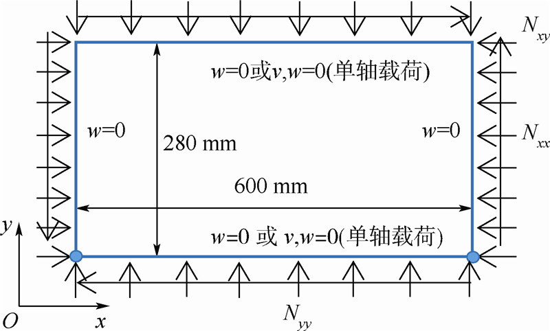 以图 5给定的矩形加筋板作为优化实例.优化目标选择临界屈曲载荷,初始板厚设为2.6 mm,材料选用2039铝合金.假设筋条中单位长度上的分布载荷与板边分布载荷相同.加筋板边界条件采用简支,如图 5所示,其中v为y向位移,w为z向位移.