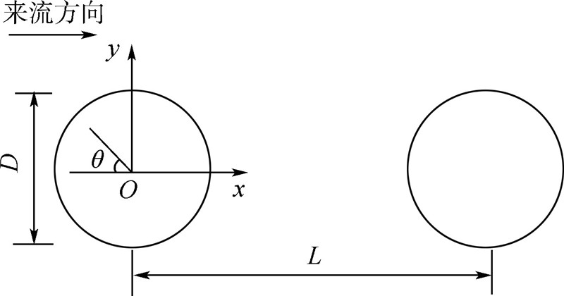 双圆柱模型由两个直径相同的圆柱体沿来流方向排列而成,如图 1所示,两圆柱体中心线之间的距离L=3.7D,D为圆柱直径,θ为圆柱方位角.坐标原点位于前圆柱圆心.自由来流马赫数Ma=0.1274,基于圆柱直径的雷诺数ReD=1.66×105.