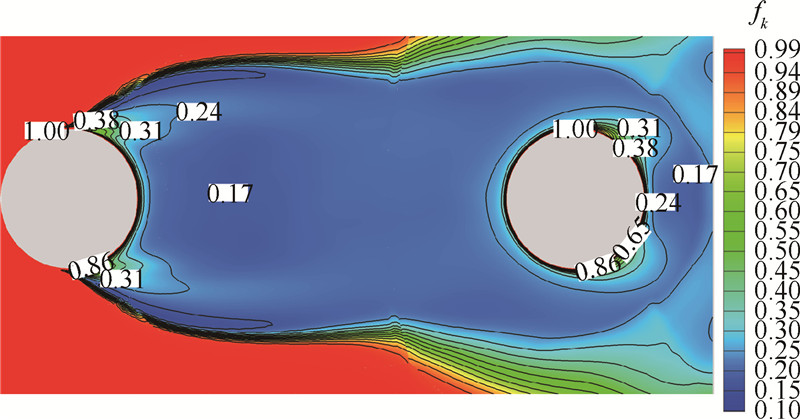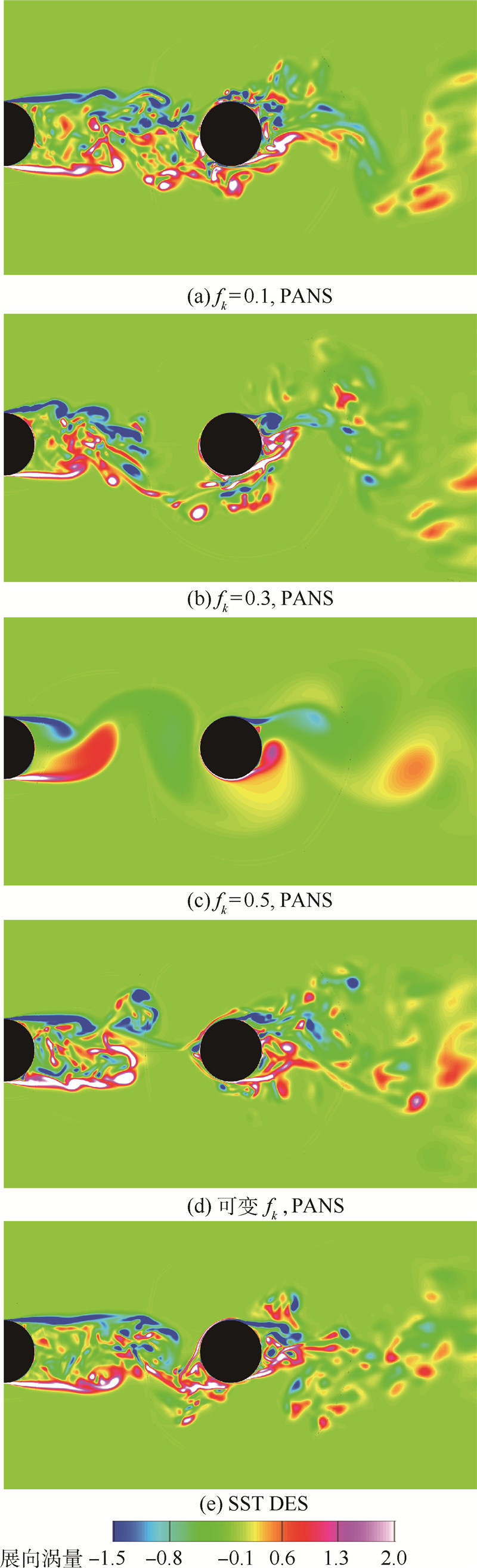 图 8为可变方法计算的fk分布.在圆柱壁面附近的边界层区域及远场,fk被限制为1,保证该区域由RANS主导;在圆柱间及尾迹区等存在丰富涡结构的区域,fk取值大致在0.15~0.25.需要说明的是,fk在上游圆柱剪切层外由小值快速变化到1,该区域不由模型黏性主导,此处fk的快速变化对PANS模型黏性影响很小,从PANS模型计算结果与实验及DES结果的对比看来,fk快速变化导致的交换误差对PANS模型的正确求解影响不大.与统一fk方法相比,可变fk方法体现出较为明显的优势.分析认为,统一方法中fk难以取到最优值,尤其对于复杂流场,统一的fk取值难以满足不同区域的计算需要;可变fk方法考虑当地网格尺度与流动信息,兼顾不同区域的计 算要求,对近壁区的流动合理地以RANS处理,同时通过调节fk的分布保证分离的剪切层和圆柱尾迹区更多的湍流尺度得以求解,适用于复杂流动模拟.