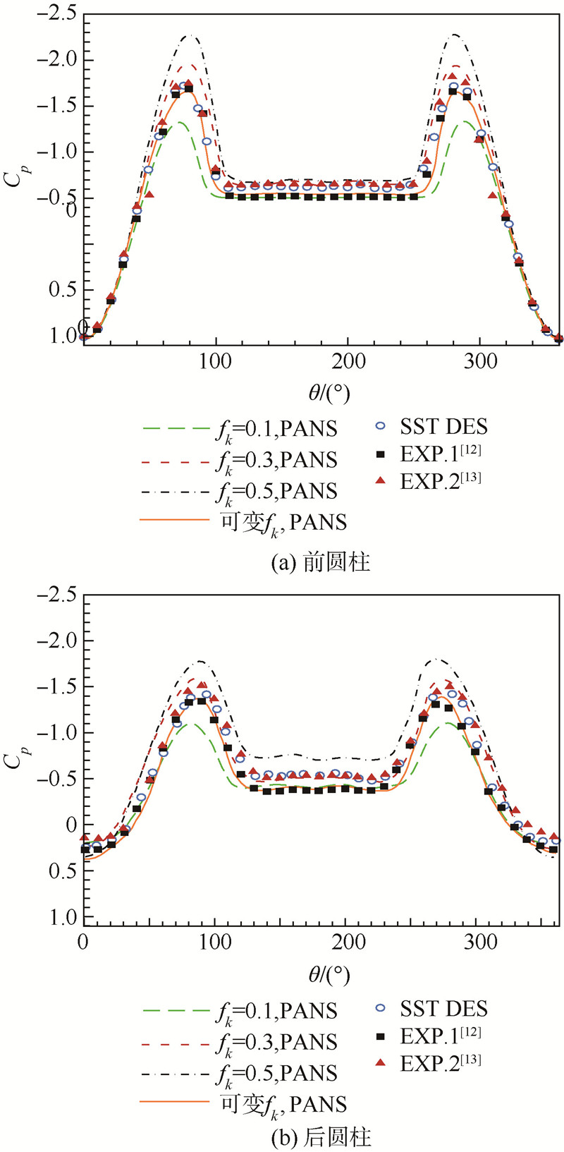 图 5为前、后圆柱壁面平均压力系数Cp分布 ,θ以上游驻点为0°,顺时针方向为正,如图 1 所示.前、后圆柱压力系数分布特点相似,均在90°位置出现压力峰值,圆柱背风面分离产生压力平台区,压力系数保持在-0.5左右.图 5~图 7中“EXP.1”来自文献[12]实验结果,“EXP.2”来自文献[13]实验结果.对前圆柱,fk=0.1的统一方法所模拟的压力峰值(绝对值)最小,分离提前;fk=0.3及fk=0.5时所得压力峰值高于实验值,分离推迟,分析认为这是由于其模拟的涡黏性偏高造成的.可变fk方法与实验结果及SST DES计算结果均吻合较好,差异不大.对后圆柱,不同方法所得结果的规律性与前圆柱一致,仍为可变fk方法和SST DES方法与实验结果最为接近.其中,可变fk方法与“EXP.1”结果更为接近,SST DES方法更接近“EXP.2”的结果.
