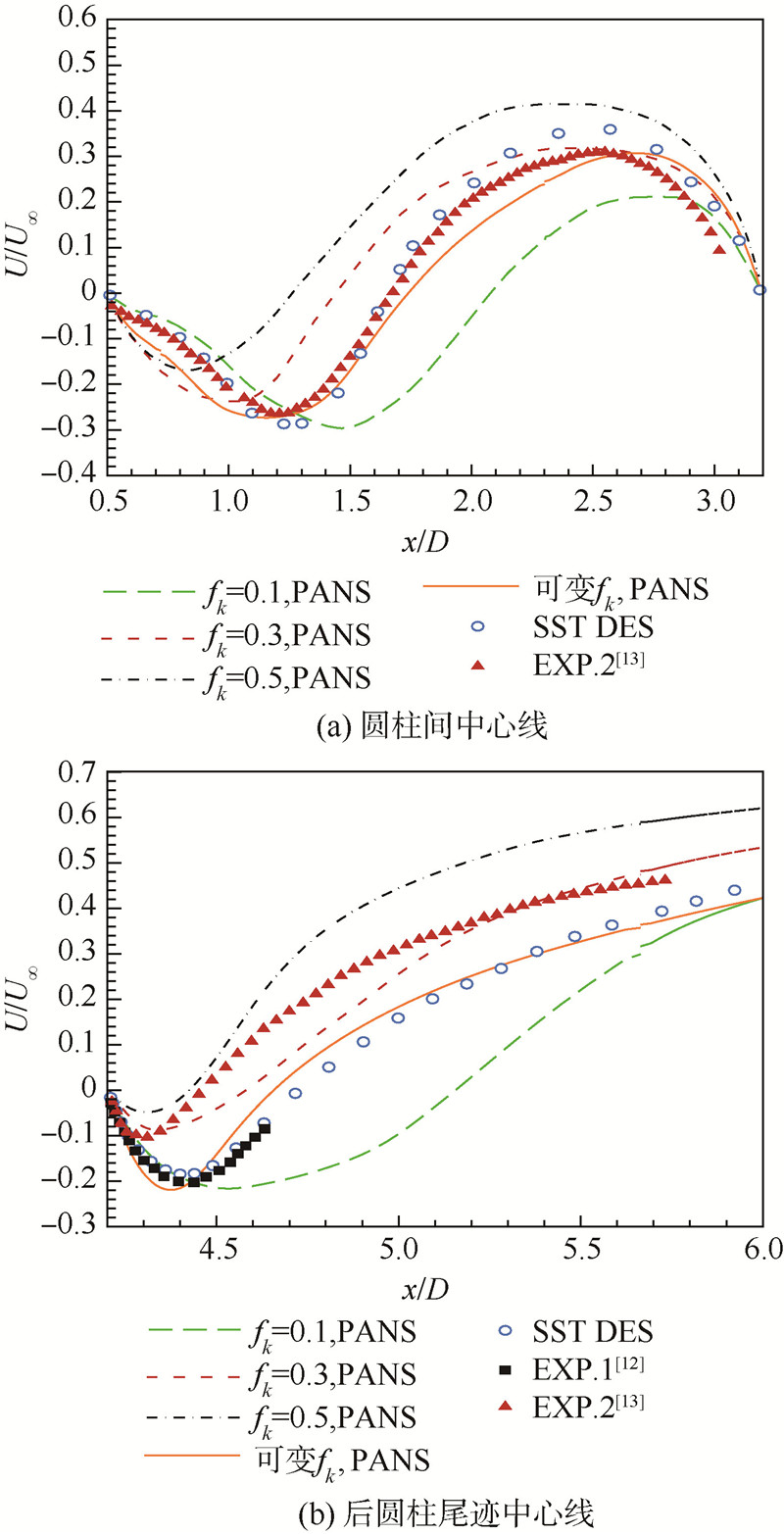 图 6给出了不同方法流场中心线上平均流向速度分布的对比,横坐标为x坐标与D的比值,纵坐标为流向速度u与来流速度u∞的比值.流动经过前、后圆柱均出现分离区,对应平均流向速度小于0的区域.对比各方法,计算得到的分离区大小差异明显.对于统一fk方法,随着fk取值增大,所得分离区逐渐变小.可变fk方法与SST DES和实验结果均吻合较好,仅存在细微差异:在圆柱间区域,可变fk方法所得分离区略大于实验结果和SST DES结果;在后圆柱尾迹区,可变fk方法所得分离区稍小.需要注意的是,图 6(b)中,“EXP.1”为后圆柱有转捩带装置的实验结果,可以看出转捩带对流向速度的实验结果有明显影响,可变fk方法和SST DES的计算结果与带有转捩带的实验结果更为吻合.