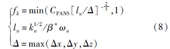 由此,通过将SST模式中的常数替换为与fk和fω有关的函数,较为便捷地得到了PANS方法模型方程.PANS方法中,通过调节fk和fω的值,决定模化的湍动能/耗散率的比例,进而确定求解的湍流尺度.对于高雷诺数流动,一般取fω=1/fk,fk可选取不同的值[7].然而对于复杂流动问题模拟,尤其是针对高雷诺数流动的近壁区,在计算网格密度达不到大涡模拟的要求时,采用RANS处理是更为合理的,此时fk在近壁区取值为1,PANS方法退化为RANS,而在其他流动区域(分离区或尾迹区)fk取值小于1,以求解部分的湍流尺度.因此,PANS方法中,fk可变的做法是更为合适的.但在方程(4)和方程(5)的求导过程中,可变fk的引入会增加额外的fk对于时间和空间的导数项(或称之为交换误差),目前的PANS方法忽略了交换误差对计算结果的影响.