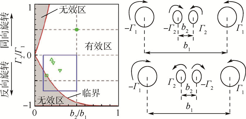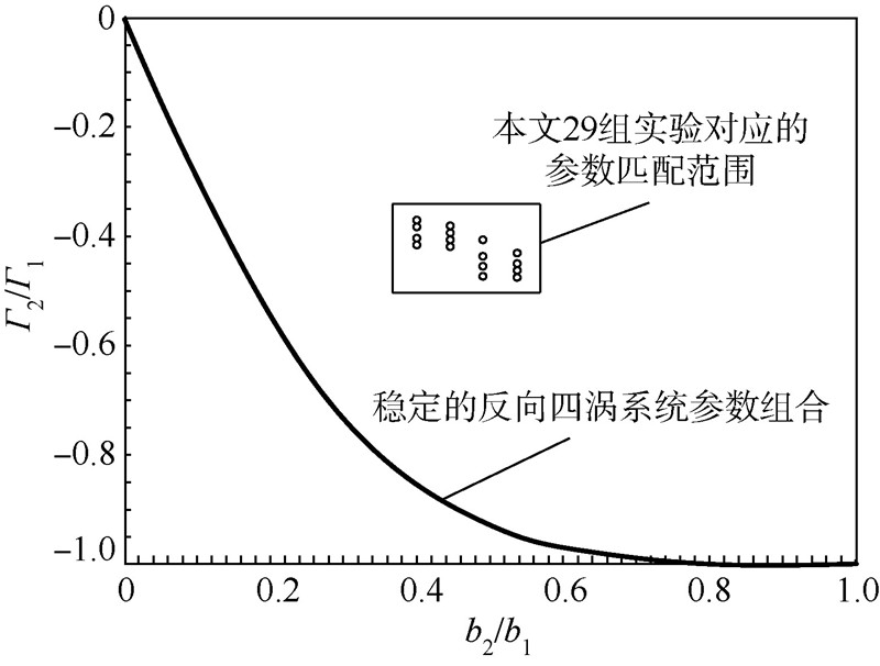 图 12中的曲线表示稳定的反向四涡系统的参数组合;黑色矩形框表示本文29组实验对应的参数匹配范围.主涡在45个翼展衰减大于50%的参数组合主要集中在0.5≤b2/b1≤0.55,0.44≤Γ2/-Γ1≤0.49,在本文设置的实验组合中,b2/b1=0.5,Γ2/-Γ1≤0.489的主翼涡能量衰减最佳.