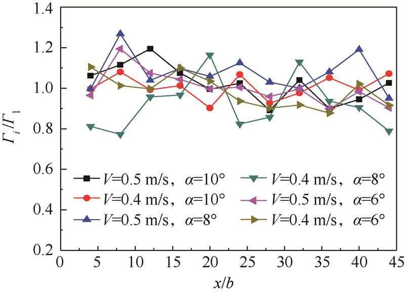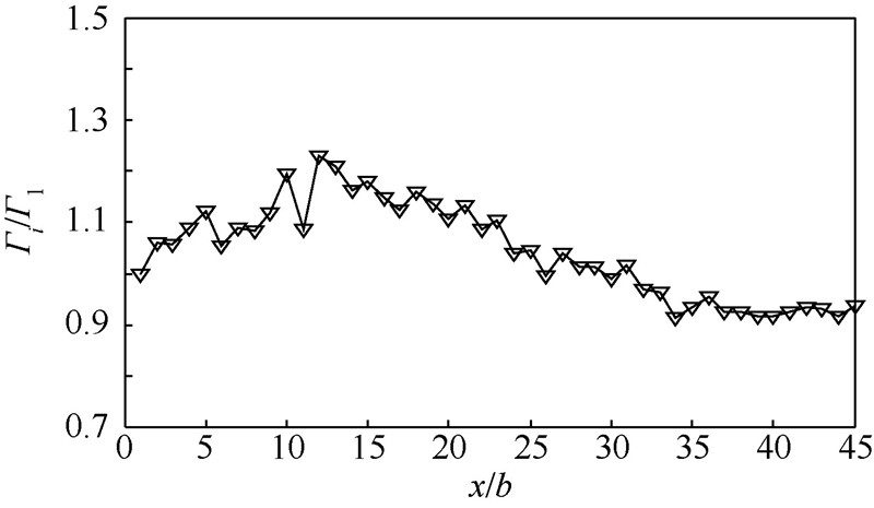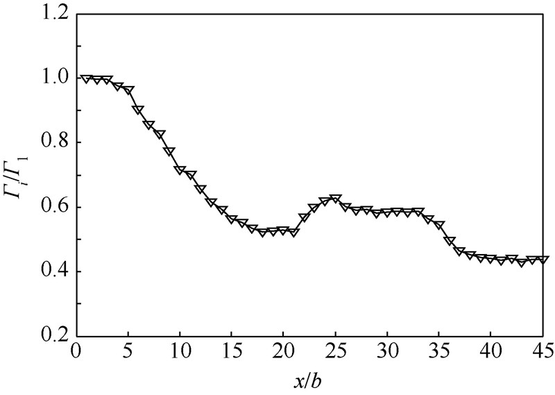 本文对主翼攻角α=10°、拖曳速度V=0.5m/s下无扰流片时主翼涡在45个翼展的相对环量Γi/Γ1进行统计,其环量发展曲线如图 6所示,主涡能量在前12个翼展呈现一定的增强,出现了一个“环量增加区”,而后开始了缓慢地衰减,在45个翼展环量衰减的幅度不大,在36~45个翼展内,相对环量基本稳定在0.92.