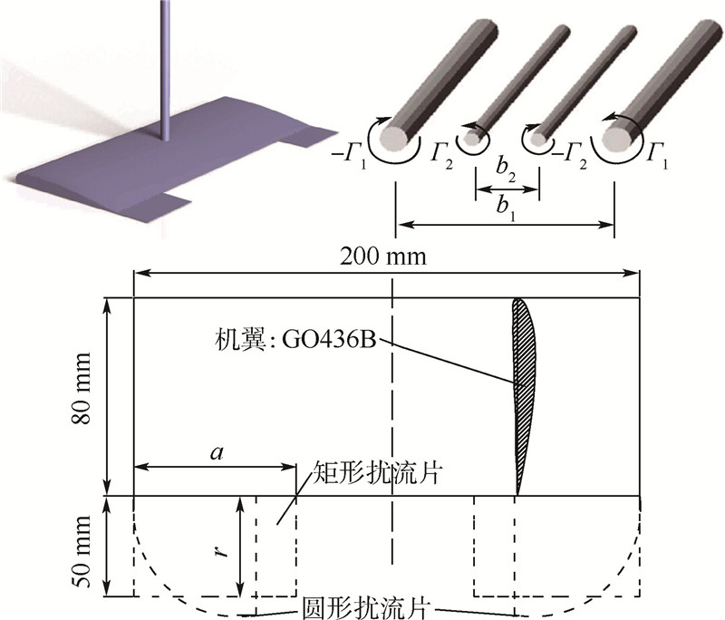 | a—矩形扰流片的宽度;r—1/4圆扰流片的半径. 图 2 实验模型及其生成的四涡系统示意图 Fig. 2 Schematic of experimental model and four-vortex wake system tailored by the model |