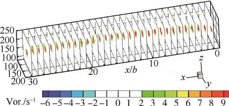在矩形机翼左右两侧分别安装不同形状与大小的扰流片,对尾涡R-L不稳定性进行分析.为与单主翼涡的发展形成对比,本文选取参数组合为主翼攻角α=10°、拖曳速度V=0.5m/s下添加矩形扰流片下的尾涡在30个翼展内的发展情况为例进行说明,尾涡发展如图 8所示(红色代表逆时针旋转的漩涡,蓝色代表顺时针旋转的漩涡).