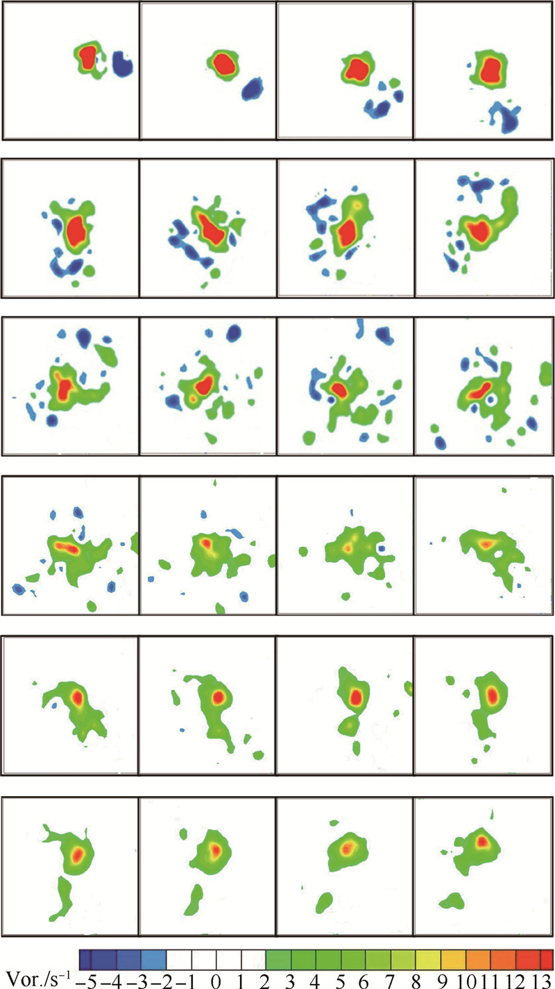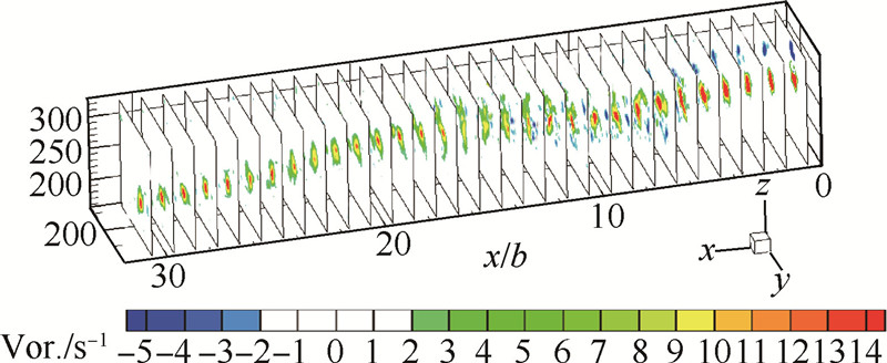 主涡和小涡生成后,都具有很高的涡量ω,且能量集中.主涡右侧的小涡在主涡的诱导作用下,表现为绕主涡顺时针旋转,在第5个翼展处开始发生相交,两涡的涡核开始发生扭曲,出现明显的变形,涡核形态逐渐失稳,涡核半径不断扩大,流场中涡量的分布不再集中,表现为很多杂乱无章的漩涡,直至小涡运动到第14个翼展附近消散为止.在第16~17个翼展后,流场中不规则漩涡开始聚拢,形成新的主涡,但主涡的旋转能量较之前明显降低.