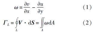 在流体力学中主要采用速度环量和涡通量表征漩涡的强度,文中通过计算测试区域不同时刻的环量变化来表征主涡消散过程中的强度变化.在实验过程中,用于PIV数据采集和数据处理的Dynamicstudio软件能够直接分析出测量区域的速度分布,并对速度场求旋度得到测量区域的涡量分布,二维情况下,涡量ω的计算的如式(1),其中:v与u分别为x与y方向的速度分量,环量是流场中速度在某一封闭周线切线上的分量 V 沿封闭曲线 S 的积分,环量Г的计算可以根据斯托克斯公式表述为式(2),即可以根据对涡量的面积分A求得环量.在数据处理过程中统计分析相对环量Γi/Γ1(第i个翼展处的环量Γi比初始环量Γ1)的变化来表征主涡环量的演变过程.