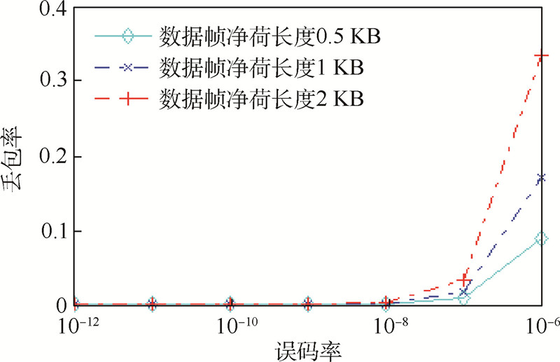 有差错传输时,网路使用效率与不同数据帧净荷长度、节点处理时间、一个交换包含的数据序列之间的关系相同,但由于误码的存在会造成整个交换过程中序列和帧的重传,即丢包现象,误码率与数据帧净荷长度、丢包率之间的关系如图 5所示.从图中可以看出,当误码率达到10-8以下时,丢包率变化很小,在可接受范围内.当误码率达到10-6,数据帧净荷长度为2KB时,丢包率超过30%,整个交换过程重传的代价剧增,网络传输效率急剧下降.