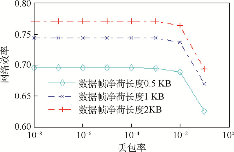 同时,网络传输效率与数据帧净荷长度、丢包率的关系如图 6所示.从图 6可以看出,丢包率在10-2以下时,对传输效率的影响很小.此时,数据帧净荷长度设置为2KB,可获得70%以上的传输效率.按照FC-AE-1553协议的要求,光纤传输的误码率一般优于10-12,故在实际工程中由于误码率引起的丢包率很小,远小于10-2,并可通过差错重传机制解决,对交换过程的影响可忽略.