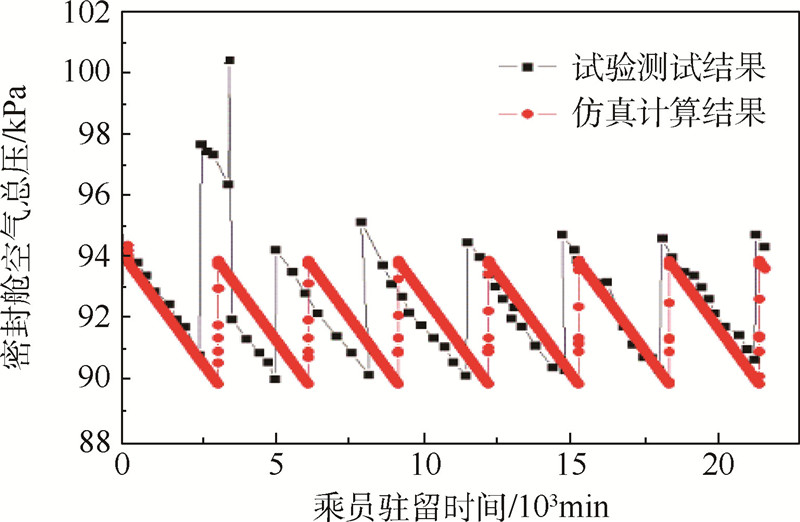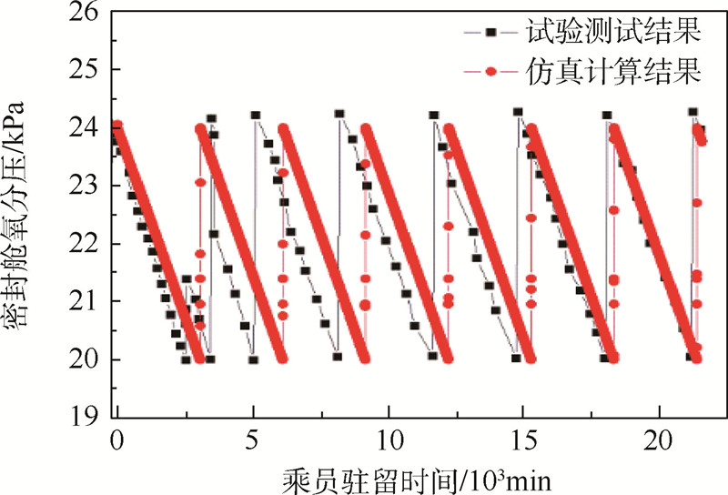 数学模型设定与驻留试验一致的密封容积、航天员耗氧速率、氧分压上下限阀值,并设定密封舱内空气温度为21℃,将计算结果与试验结果进行对比,如图 3所示.