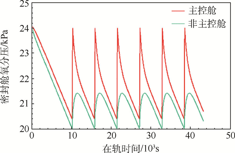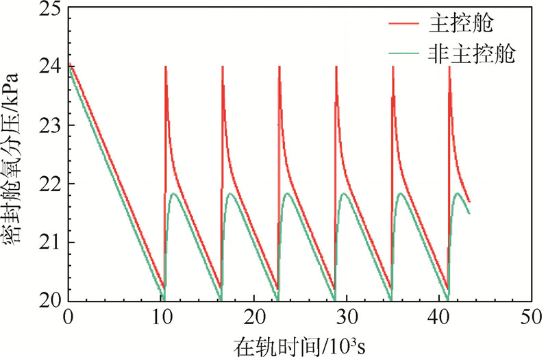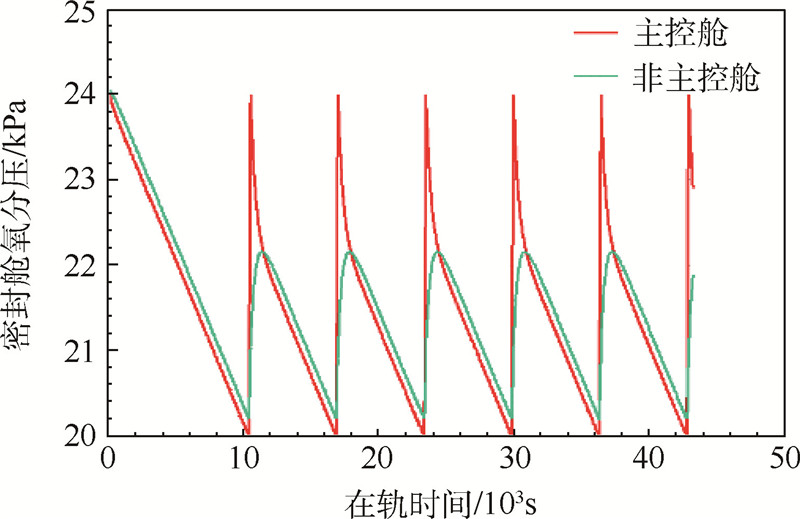 2) 参考“国际空间站”[8]的指标要求,两密封舱氧分压控制范围为20~24kPa,总压控制范围为87~100kPa.