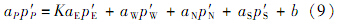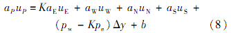 前板-柔片间隙和背板-柔片间隙区域的网格划分采用交错网格技术[15],使每个网格点周围分布互不重叠的控制体,如图 3所示.P用来标识一个广义的节点,其东西两侧的相邻节点分别用E和W标识,南北两侧的相邻节点分别用S和N标识,控制体东西两侧的界面分别用e和w标识,南北两侧的界面分别用s和n标识.Δyn、Δys、Δxe和Δxw分别为节点P到节点N、S、E、W的距离;h为主控制体X方向的宽度;k为主控制体Y方向的宽度;un、us、ue和uw分别为主控制体相应界面上x方向速度值;pWC、pEC、pNC和pSC分别为节点W、E、N、S的压力值; pP为主控制体节点处的压力值.压力和密度在控制体的网格节点上存储计算,而速度分量则分别在交错网格的节点上存储计算.将连续性方程和Navier-Stoke方程对控制体积分,即可得到关于求解变量u、v、p的离散方程,运用SIMPLER算法对离散后的方程进行求解.