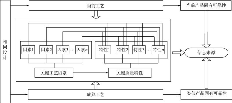 产品的固有可靠性是由设计和加工过程决定的,产品加工过程中的质量特性符合工艺规范要求的程度,反映了产品的固有可靠性与设计可靠性的差距.而质量特性通常是在多道工序过程中形成,且每道工序都有对其产生影响的工艺因素.对产品进行故障机理分析和故障模式影响分析(Failure Model Effect Analysis,FMEA),可以确定相应的关键质量特性和关键工艺因素.产品的可靠度可以通过关键质量特性满足工艺规范要求的程度来反映,也可以通过关键工艺因素满足工艺要求的程度来反映.另外,在产品加工完成后,为了剔除早期失效,并在较短时间内获得必要信息,通常会进行加速应力筛选试验.而且设计和装配相同,仅存在工艺差异的同类产品可靠性信息也可以通过历史数据得到.因此,在可靠性评估中,确定其信息来源为关键工艺因素、关键质量特性和产品可靠性3个方面,其中,产品可靠性信息包括当前产品可靠性信息和类似产品可靠性信息.这三者之间的关系如图 2所示.