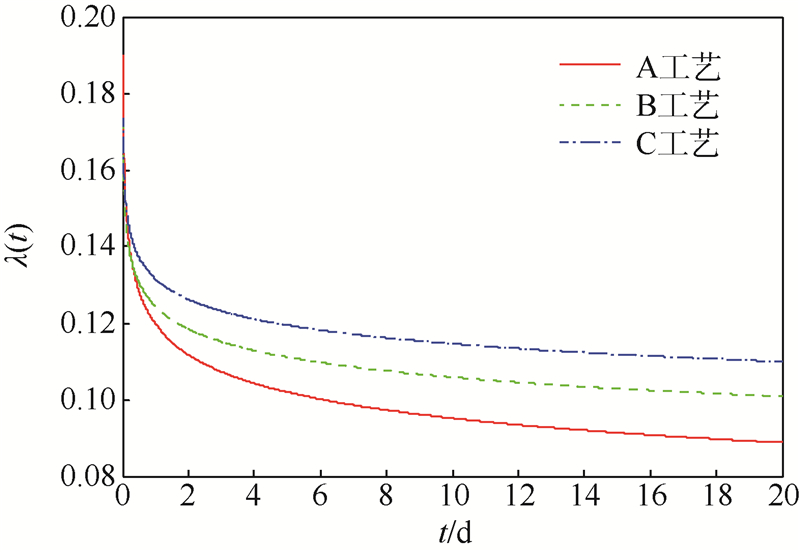 由式(3)可以得到产品早期失效率的分布函数如图 3中A工艺所示,依据历史数据得到B和C工艺加工产品的早期失效率,如图 3所示.从图中可以明显看出3种工艺的优劣顺序.且优化后的A工艺加工产品的早期失效率在较短的时间内就迅速下降,可以保证后续使用过程中的可靠性要求.