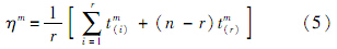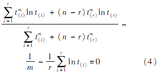 因为在早期故障期和偶然故障期造成产品故障的失效机理不同,若直接采用单一形式的分布对产品失效数据进行拟合可能会出现较大误差,所以需要判断产品失效数据的失效阶段.文献[12]表明,若产品失效数据在威布尔概率纸上反映为没有拐点的直线,则说明收集到的产品失效数据主要由一种失效机理造成,可选用单阶段威布尔分布进行拟合,反之则需采用两重威布尔分段 模型来拟合产品失效率分布曲线.本文假设首 先对收集的失效产品进行失效原因分析,剔除偶然失效阶段的失效数据,然后选用单阶段威布尔模型表示产品失效率.此时,若投入n个样本产品进行试验,至有r个失效时停止试验,整理失效时间的顺序统计量为t(1)≤t(2)≤…≤t(r).对其似然函数取对数并求导,整理化简后可得