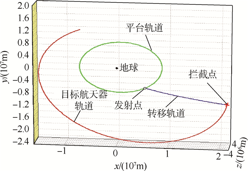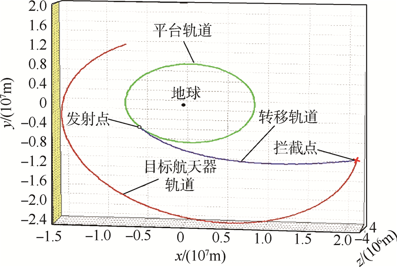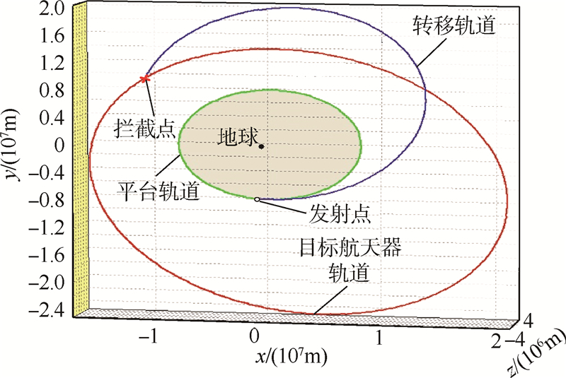 2) 拦截器变轨是在一次速度脉冲的作用下瞬间完成的.轨道转移能量消耗应有上限约束,即Δv≤vmax,本文将拦截器最大变轨脉冲限制为vmax=8.5km/s.