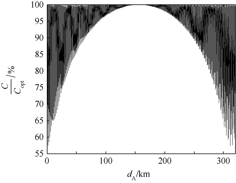 从图 10可以看出,当dA∈[0.64,2.49]×105 m 时,无论dA的误差有多大,信道容量都不会低于最大值的90%.这时候完全可以不再严格要求dA满足最优条件,也可以保证即便是由误差导致的最差情况下,系统也能够达到足够的信道容量.