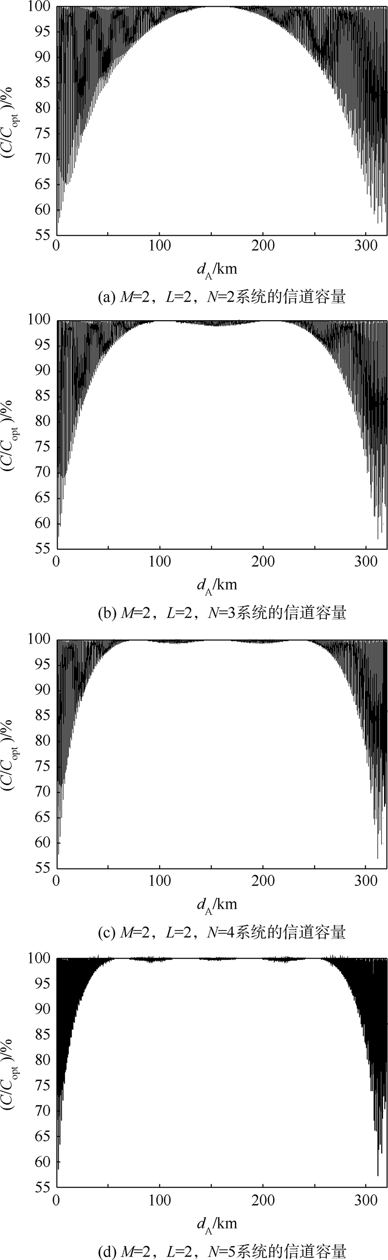 由图 6可以看出,不同N值的信道容量曲线波动状况极为相似.然而,如同3.2节讨论的情形一样,信道容量的极大值和极小值相差很大、波动很快,例如图 6中M=2、L=2、N=2的系统,一个周期内信道容量达到最大值的90%以上的情况约占57.6%,考虑到数量级,实际生产中要求dA的偏差不能超过±0.24 m,对L≥3的系统而言则更小,否则就可能造成信道容量的极大衰落.
