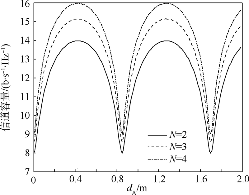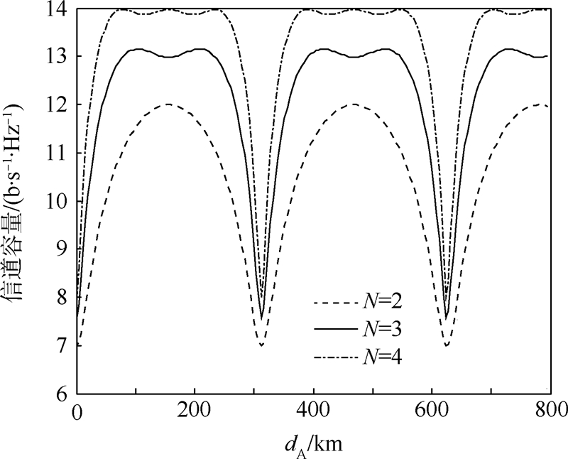 可以看出,信道容量是与dA有关的周期函数,且变化周期与卫星数目成反比,远大于第3.2节中的情形.能够达到最大信道容量的地面天线间距