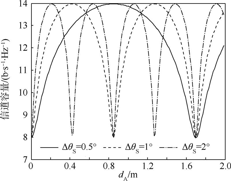 2) 信道容量曲线关于dA呈周期性变化,其周期性体现在:一是小数量级时的峰-谷波动(由多卫星引起),其谷-谷周期为DO=c0h/(dOf0cos δ);二是大数量级时函数曲线包络的周期性(由卫星上的多天线引起),其包络的周期为DS=c0h/(dSf0cos δ).