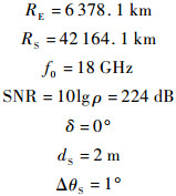 (单位:(°))为相邻两颗卫星之间的角度间隔,RS(单位:m)为同步卫星轨道的半径;每个卫星天线阵列相邻两根发射天线之间间距为dS(单位:m).