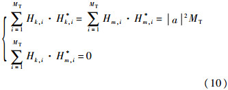 文献[15, 16]证明,信道容量取最优值Copt的前提条件是矩阵V的所有非零特征值相等,即γ1=γ2=…=γMR=|a|2MT.因此,满足最大信道容量条件的H为任意两行元素都正交的矩阵.