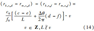 此时,φl_n成等间距分布,因而与φl_n成比例的rk,l_n-rm,l_n有着恒定的差分关系.任取两根地面天线和两根卫星天线,对第k根和第m根地面接收天线,与第c颗卫星上的第d根天线和第e颗卫星上的第f根天线而言,代入得