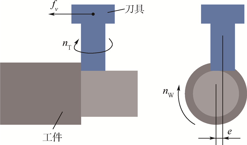 1 正交车铣运动关系的描述 1.1 正交车铣概述正交车铣复合加工是随着制造业的进步而逐渐发展起来的一种相对较新的切削加工技术.正交车铣加工中铣刀回转轴线与刀具回转轴线相互垂直,刀具以nT转速高速旋转,并以速度fv沿着工件轴向作直线进给运动;工件则以较低的转速nW旋转.这样的运动关系使其适合于外圆柱表面的加工.工件旋转速度、工件直径、刀具旋转速度以及刀具沿工件轴向进给速度共同决定着每个刀齿周期切除材料的多少.当两条轴线之间距离e=0时为无偏心车铣,e>0时为偏心车铣(见图 1).偏心距离的大小对于正交车铣加工过程具有重要影响[17].