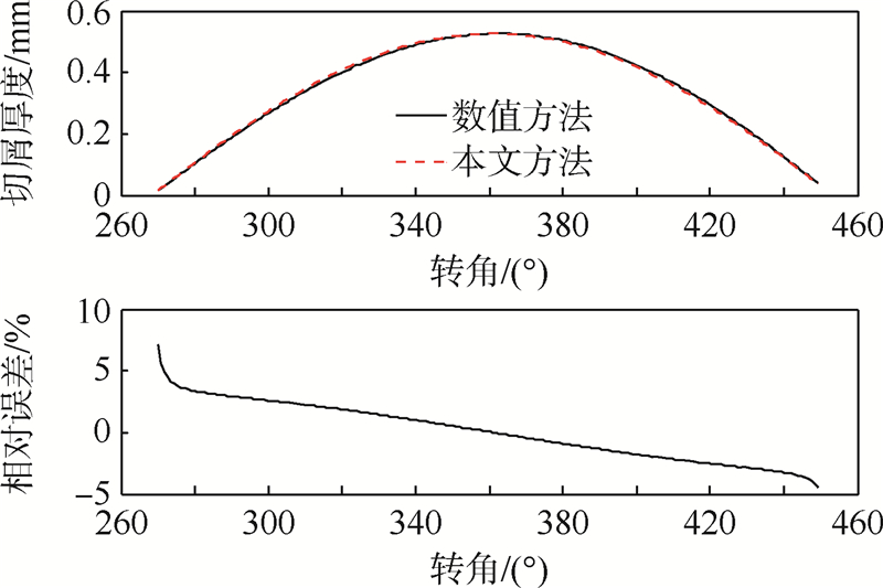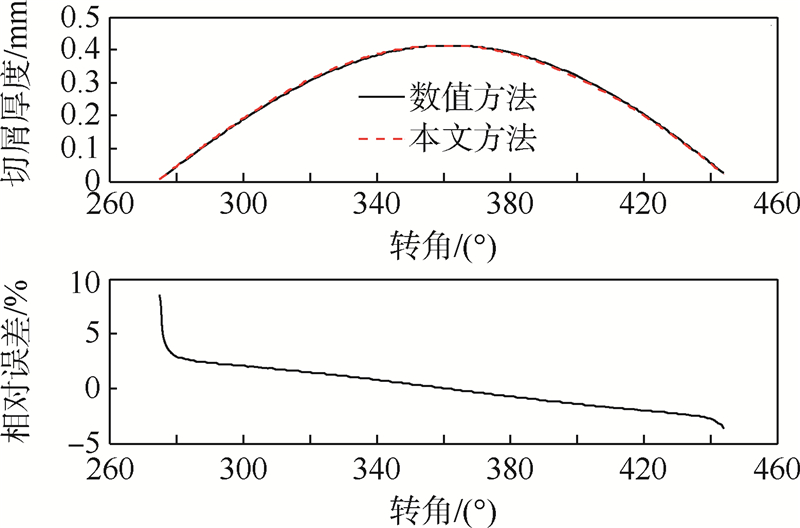 为了验证本文所给出的切屑厚度计算方法,同时采用数值方法[12]和本文方法针对几组实例进行仿真并比较二者的结果.数值计算方法采用真实的刀刃轨迹,需要用迭代的方法进行求解.仿真结果如图 6~图 8所示,其中,横坐标表示所分析的切削刃点的转角,即前文所提到的接触角.每张图的上半部分为得到的切屑厚度的对比,图的下半部分给出的是相对误差的情况,其计算公式为