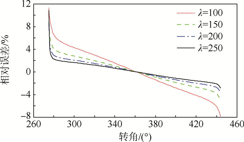刀具工件转速比是正交车铣加工过程区别于传统铣削加工过程的一个重要参数,其对切削过程具有很大的影响.图 9给出了转速比λ的改变对本文所给出的切屑厚度计算方法的误差的影响情况(通过对前文所述的γ=45°的铣刀加工实例进行仿真得到).从图中可以看出,随着转速比λ的减小,误差将会增大.