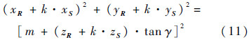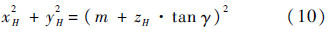 根据前面的假设,点H位于圆台体的侧面上,因此它的3个坐标值满足: