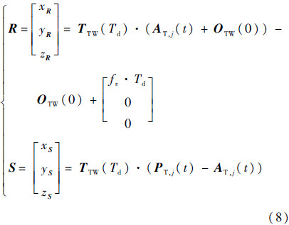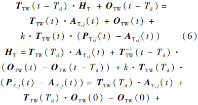 进一步代入各项的表达式可以得到式(6),其中,HT′表示点H在t-Td时刻的刀具坐标系(记为T′)中的坐标值.将式(6)等号两侧同时乘以矩阵TTW(t-Td)的逆,并整理便得到式(7).