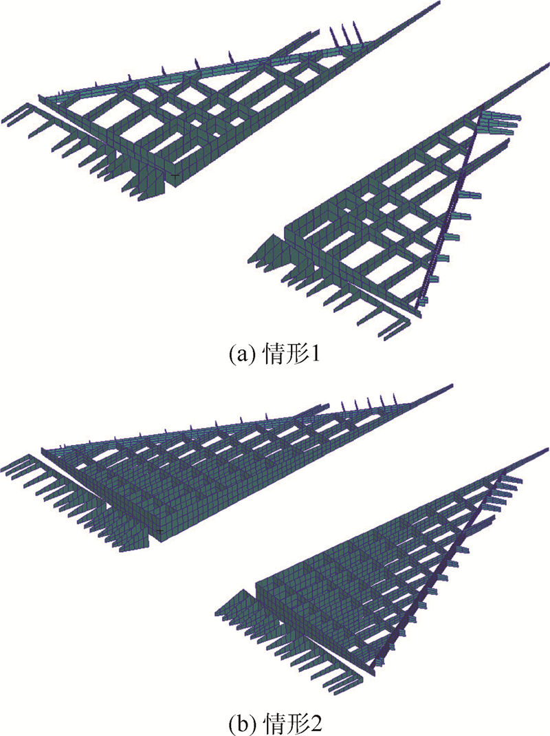 | 图 9 情形1和情形2下的机翼有限元网格Fig. 9 Finite element (FE) meshing of wing in Case 1 and Case 2 |
