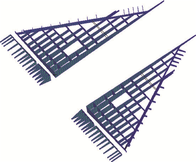 在第2种参数设置下,通过给定开口参数、翼肋贯穿位置参数及桁条对应梁/墙序号参数,可以得到细化的骨架有限元网格,如图 11所示.