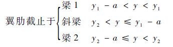 2.3 网格划分 2.3.1 骨架布局的确定在自定义气动外形所对应的主受力盒区P11中,设计人员给定局部坐标系下的梁/墙位置参数及翼肋位置参数,在加工工艺等约束下,需要定义翼肋沿x方向贯穿位置,即通过图 5中y与y1、y2的自定义逻辑关系计算翼肋贯穿位置的x坐标值,以确定机翼骨架几何布局满足设计人员的要求.本文引入工艺参数a,通过