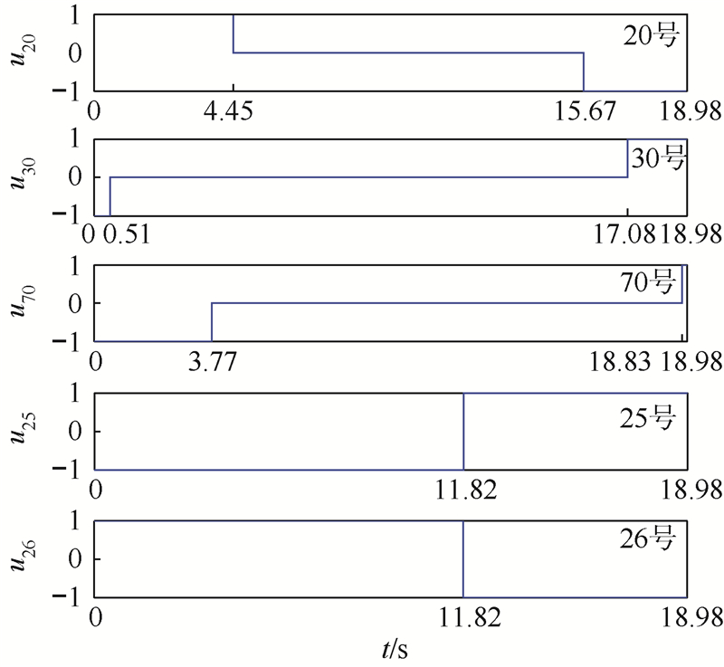 图 3给出部分智能体在通过局部求解得到的控制输入.可以看出最终收敛状态位于起决定作用的25号和26号智能体的可达区域边界,因此25、26号智能体的控制输入为bang-bang形式,切换次数为1次,而其他智能体一般控制输入为bang-off-bang形式,切换次数为2次.所有控制输入在18.98 s停止.