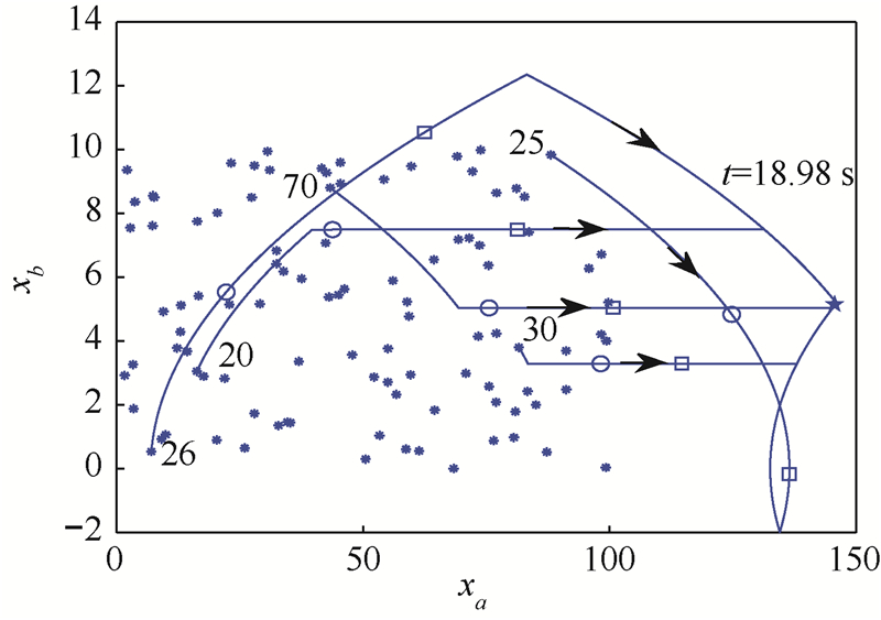 4.2 仿真结果与分析根据定理2,由二阶智能体构成的多智能体系统实现最短时间一致性的x{1,2,…,100}*与t{1,2,…,100}*至多由其中的3个“关键”智能体决定.利用本文提出的分布式协调算法,最终得到“关键”智能体为25和26,且x{1,2,…,100}*=(146.07,5.19),t*=18.98 s.仿真结果如图 2所示.
