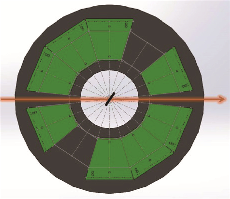 考虑到灵活性,将靶死区角与探测器个体所占角度进行相同设置.扣除束流空间所占角后,将剩余角度10等分,其中8块区域放置探测器,另外2块作为靶死区,如图 2所示.
