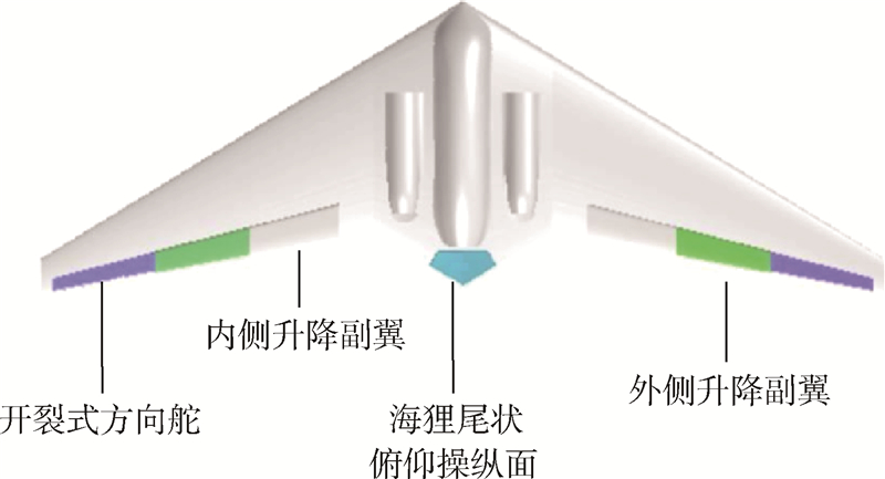 3 算例与结果分析 3.1 算例对象选取FW-H[13, 14]大展弦比飞翼布局飞机为研究算例.计算所用原始数据均来源于中国空气动力研究与发展中心的风洞试验.FW-H飞翼飞机构型如图 1所示,采用小后掠角(30°)大展弦比(9.3)无尾三角翼布局,共设有4组7块操纵面,分别为开裂式方向舵、内侧升降副翼、外侧升降副翼以及海狸尾状俯仰操纵面.其中,海狸尾状俯仰操纵面起俯仰轴修正操纵作用,其与升降副翼共同构成阵风减缓系统(驾驶员通常无权限控制),以使飞机在低空飞行时保持平稳[15].