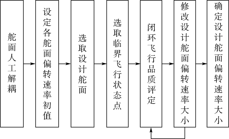 基于舵面偏转速率大小对飞机飞行品质的影响,在已完成飞机飞行控制系统设计的情形下,本文建立了飞翼布局飞机舵面偏转速率限制值的设计方法和流程:①对操纵面的操纵效能进行人工解耦;②设定各轴操纵面偏转速率限制值的初值;③分别确定飞机在三轴上对舵面偏转速率要求最大的临界飞行状态点;④选取设计舵面;⑤对闭环飞机系统进行飞行品质评定;⑥将非设计舵面偏转速率限制值固定为初值,依据品质评定结果,修改设计舵面偏转速率限制值,直至满足一级飞行品质要求.具体流程如图 2所示.