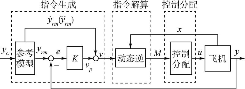 FW-H飞翼布局飞机本体的阻尼特性较差,具有多操纵面冗余配置,飞行动力学特性非线性较强,基于逆动力学结合模型跟踪的非线性自适应方法,完成设计的飞行控制系统如图 3所示.